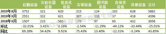 9月份,根据中国教育装备网对国内教育装备招中标采购信息量的数据统计,国内教育装备市场招标采购信息总量为4396条,环比下降25.01%,同比增长43.85%。由此可以看出,进入开学季后招标采购信息总量会呈现下降趋势。