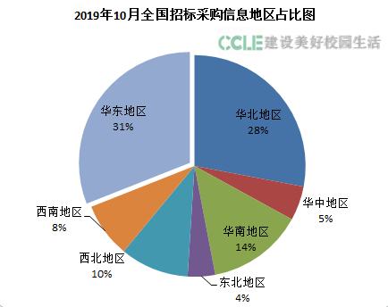 从10月中标信息地区统计图和全国中标信息地区占比图来看:华东地区中标信息量为865条,占比31%;华北地区中标信息量为521条,占比19%;华中地区中标信息量为430条,占比15%;华南地区中标信息量为402条,占比14%;西北地区中标信息量为270条,占比10%;西南地区招中标信息量为164条,占比6%;东北地区中标信息量为132条,占比5%。