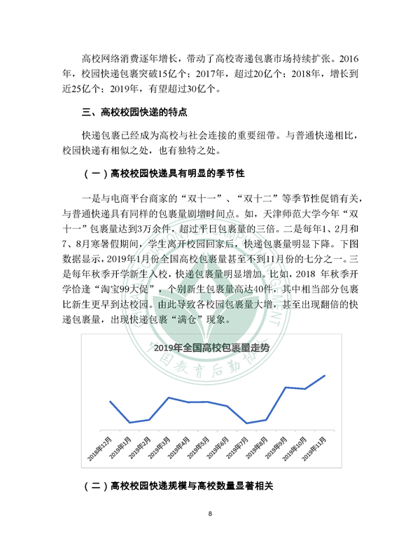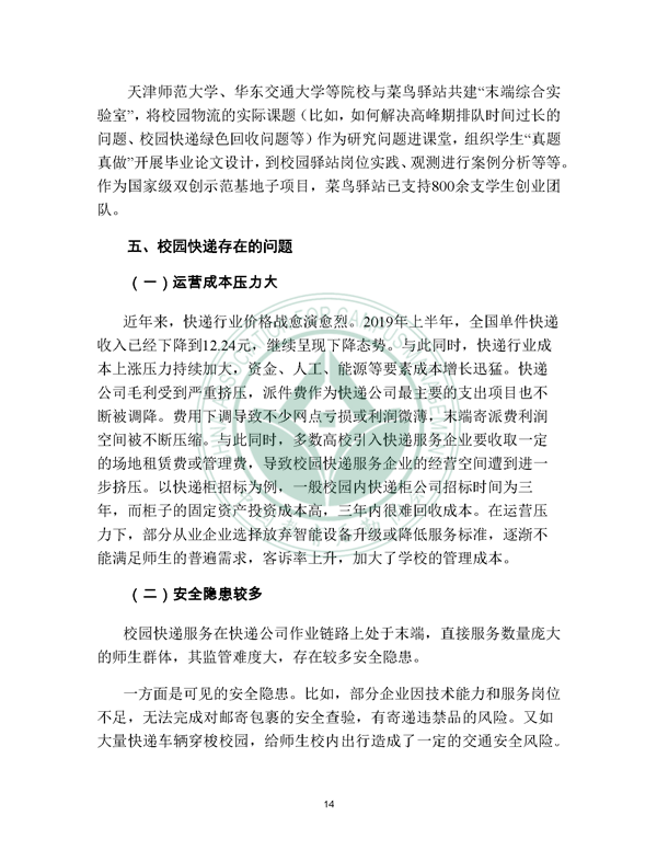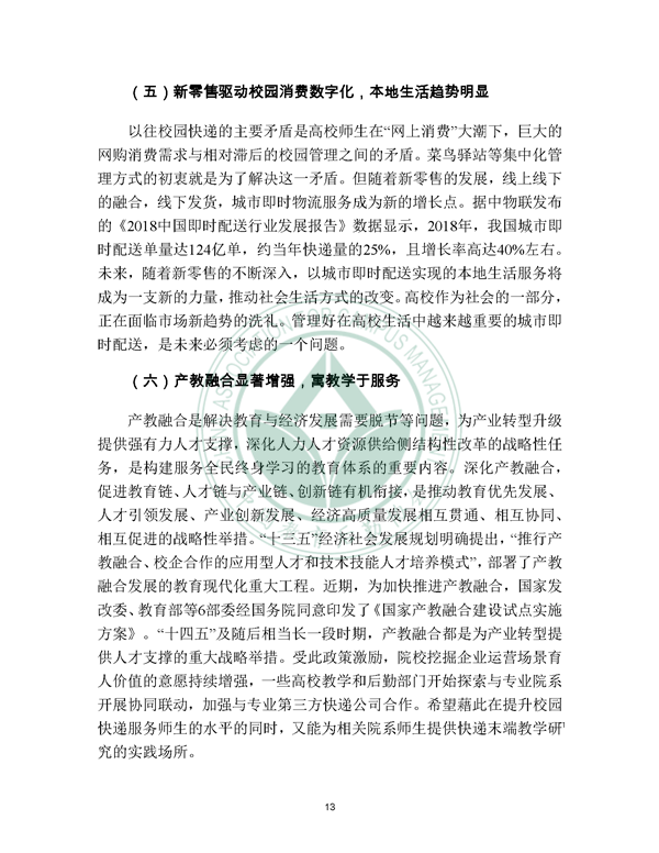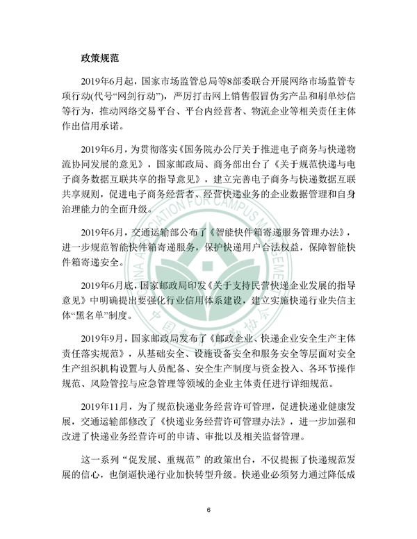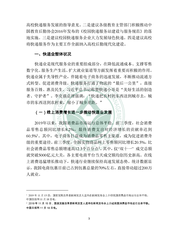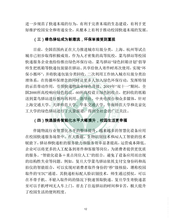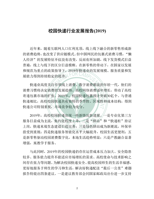 2019年12月21日, 校园快递行业发展报告(2019)发布。报告由中国教育后勤协会委托阿里研究院研究,由菜鸟网络、西南财经大学北京研究院支持。