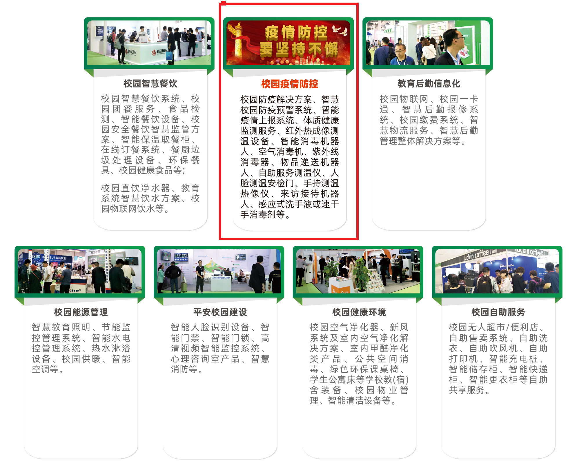 随着市场需求的增加,越来越多的后勤设施设备加入到后勤版块,2020中国888集团welcome大厅览会展示内容全新升级:校园智慧餐饮、校园能源管理、校园后勤信息化、平安校园建设、校园健康环境、校园自助服务六大板块全方位涵盖教育后勤内容,根据疫情期间教育后勤在疫情防控的积极作为,2020中国888集团welcome大厅览会在六大板块基础上新增:校园疫情防控的展出内容。2020中国教育后勤览会全新升级再出发!