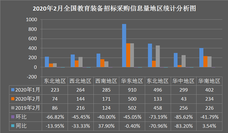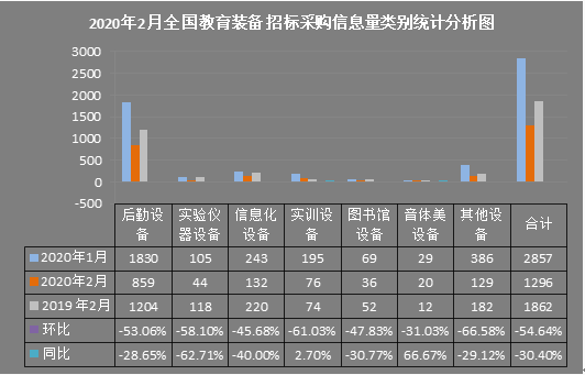 2月份各类别教育装备招标采购信息量对比情况如图2所示:后勤设备招标采购信息环比下降53.06%,同比下降28.65%;实验仪器设备招标采购信息环比下降58.10%,同比下降62.71%;信息化设备招标采购信息环比下降45.68%,同比下降40.00%;实训设备招标采购信息环比下降61.03%,同比增长2.70%;图书馆设备招标采购信息环比下降47.83%,同比下降30.77%;音体美设备招标采购信息环比下降31.03%,同比增长66.67%;其他设备招标采购信息环比下降66.58%,同比下降29.12%。由类别数据可知:后勤设备招标采购信息量整体较多,音体美设备招标采购信息量整体较少。与上月数据相比,2月份各类别教育装备招标采购信息量均大量下降,与去年同期数据相比,除实训设备、音体美设备有上涨外,其他类别教育装备招标采购信息量也均有下降。