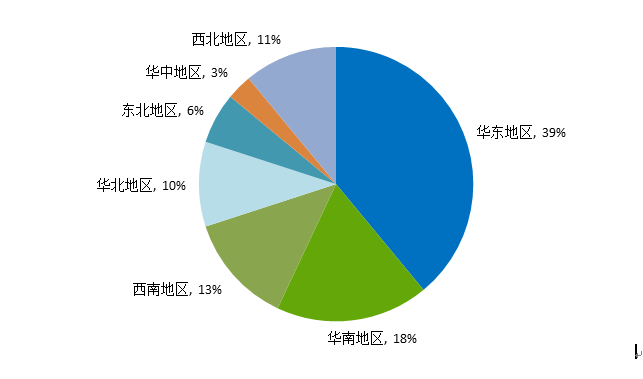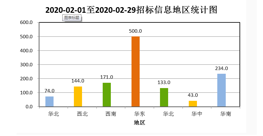 从2月全国教育装备招标采购信息地区统计图(如图3所示)和全国教育装备招标采购信息量地区占比图(如图4所示)可以看出:华东地区招标采购信息量为500条,占比39%;华南地区招标信息采购量为234条,占比18%;西南地区招标采购信息量为171条,占比13%;西北地区招标采购信息量为144条,占比11%;华北地区招标采购信息量为133条,占比10%;东北地区招标采购信息量为74条,占比6%;华中地区招标采购信息量为43条,占比3%。