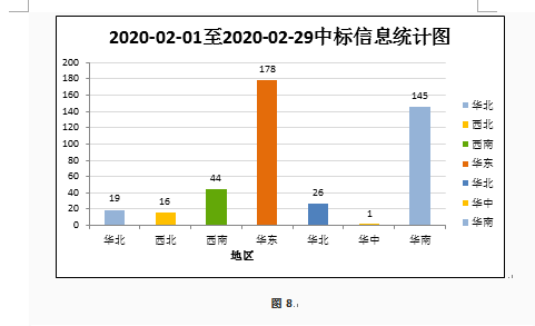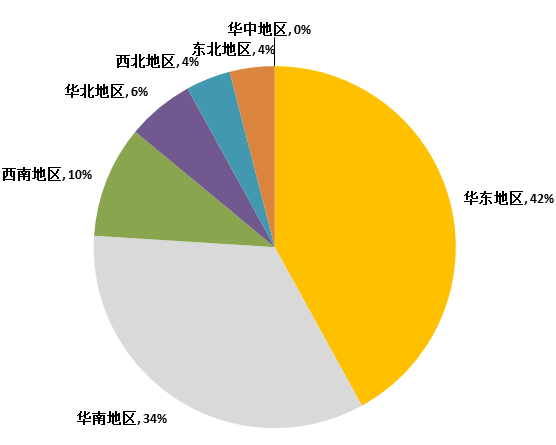 从2月全国教育装备中标信息地区统计图(如图8所示)和全国教育装备中标信息地区占比图(如图9所示)来看:华东地区中标信息量为178条,占比42%;华南地区中标信息为145条,占比34%;西南地区中标信息为44条,占比10%;华北地区中标信息为26条,占比6%;西北地区中标信息为16条,占比4%;东北地区中标信息为19条,占比4%;华中地区中标信息为1条,占比0%。