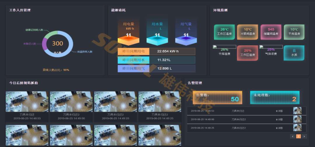 此外,系统成功接入了烟、水、气异常检测温、湿度智能监控,采用文字、图标、web控件、状态进度条的形式展示数据动态流动。有效利用大数据的魔力,为管理工作“减负减压”。