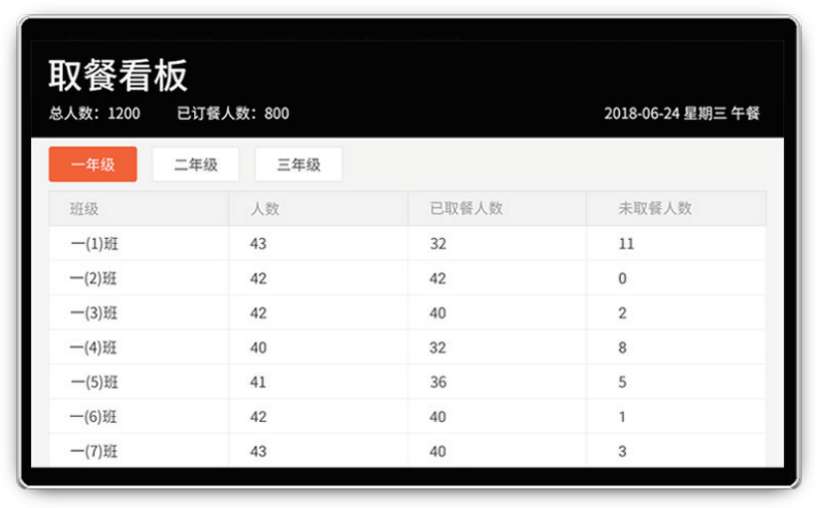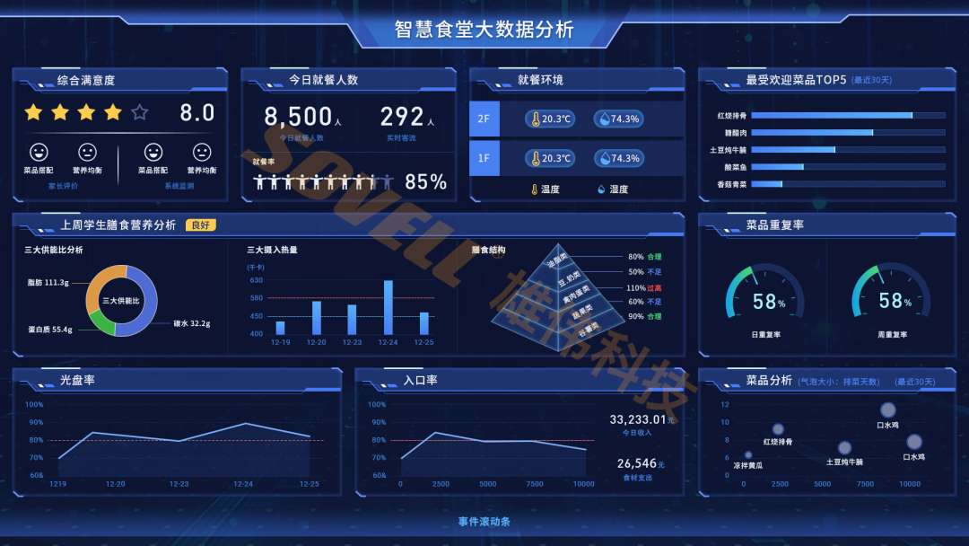 学生就餐率、入口率、光盘率、食品安全情况及家长满意度,任何数据变化都可实时反映在校长办公室的大屏上。