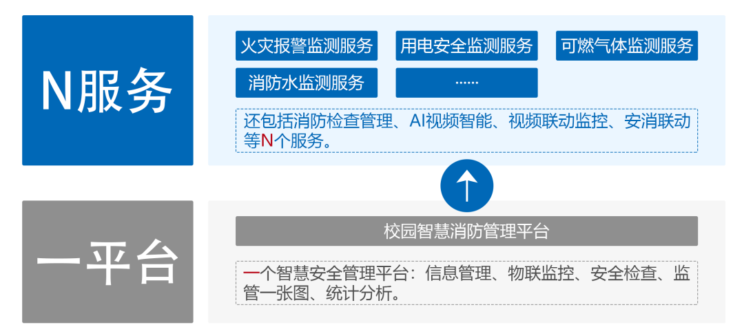 建设一个消防安全管理平台,针对校园各场景不同需求,提供N种消防安全服务,如:火灾报警监测服务、消防检查管理服务、用电安全监测服务、可燃气体安全监测服务、视频监控服务等,实时收集消防检查数据,结合消防设施巡查和消防人员值班管理,实现“人防+物防+智防”统一,把校园安全隐患扼杀在萌芽状态,全面提升校园安全管理水平。