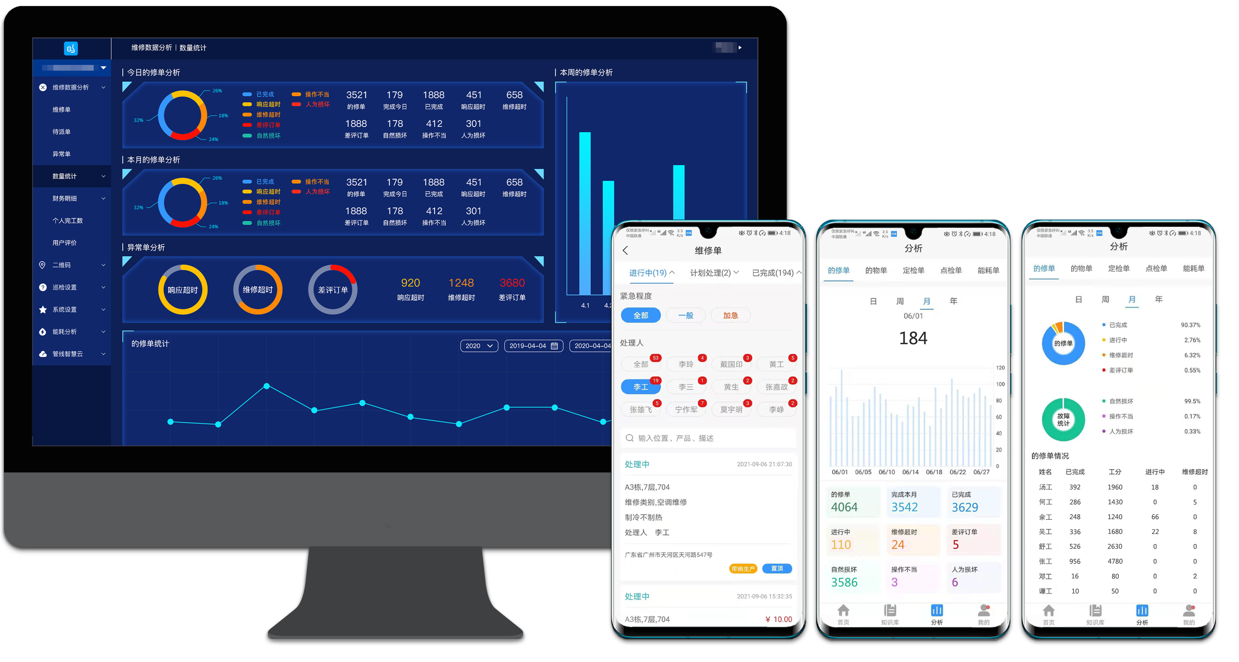 3.移动端、PC端后台实时记录维修过程,实现从报修、派工、维修、验收、评价等全流程跟踪服务管理,并通过大屏呈现的工单量、报修率、故障原因、维修超时、返修单、差评单等数据分析结果,对员工进行量化考核,制定维护决策,确保设备的正常运行。