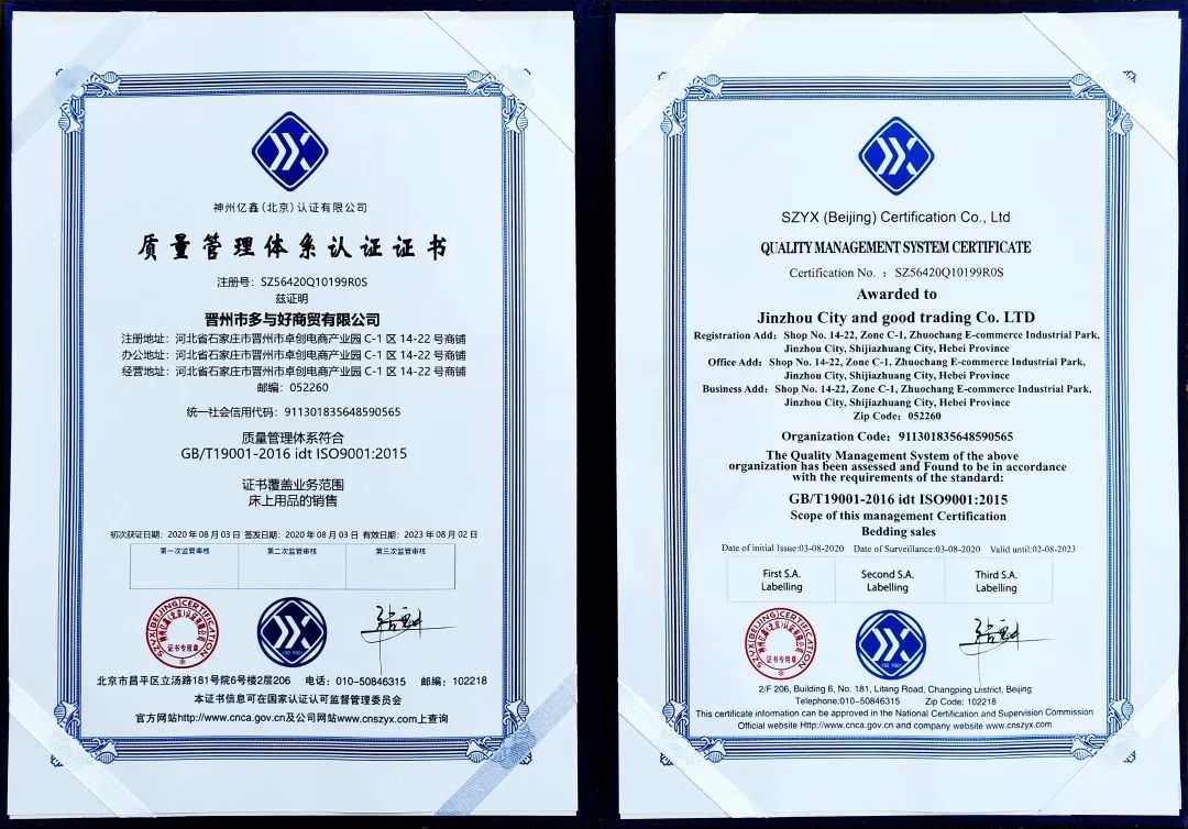 柳伊的每个产品都有省级以上质检报告,公司经过阿里巴巴实地认证、3A级信用企业认证和ISO9001质量管理体系认证,可以为顾客提供各项手续、证件和资质。