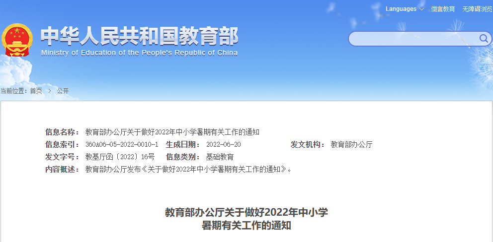 《教育部办公厅关于做好2022年中小学暑期有关工作的通知》