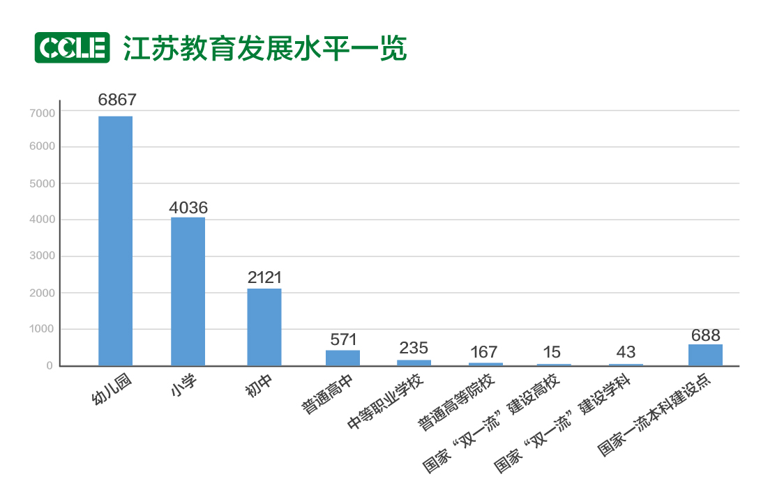 “全国教育看江苏”,江苏作为全国第一教育大省,现有幼儿园6867所,小学4036所,初中2121所,普通高中571所,中等职业学校235所,普通高等院校167所。