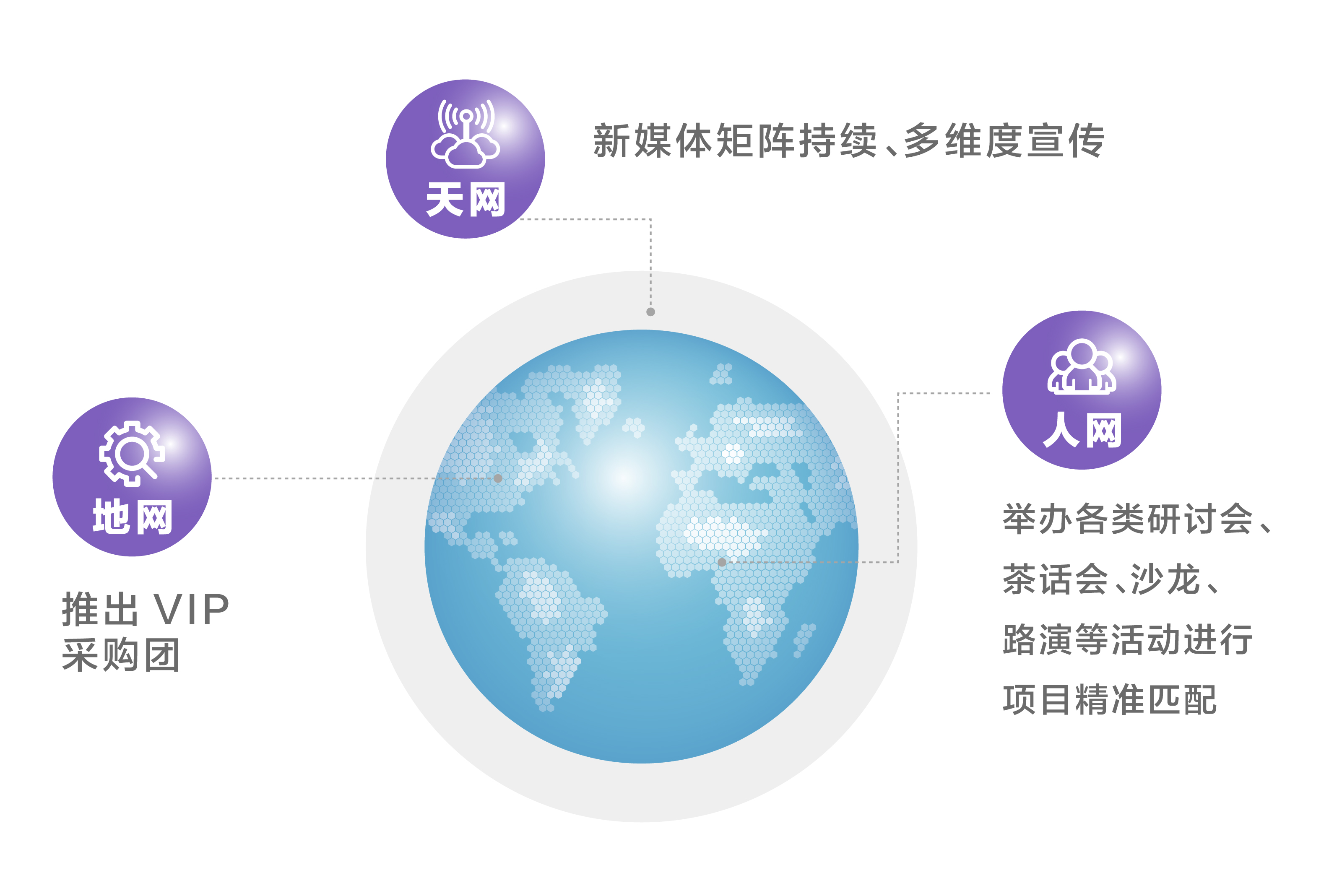 通过百度、抖音、快手、视频号、小红书等100+行业新媒体平台打造的新媒体矩阵持续、多维度宣传;同时,重磅推出VIP采购团,邀请各地教育后勤协会相关领导、老师组团到场参观、交流、采购;与此同时,利用庞大的微信、抖音群聊体系,举办各类研讨会、茶话会、沙龙、路演等活动进行项目精准匹配。三箭齐发,实现“天、地、人”三网融合推广。