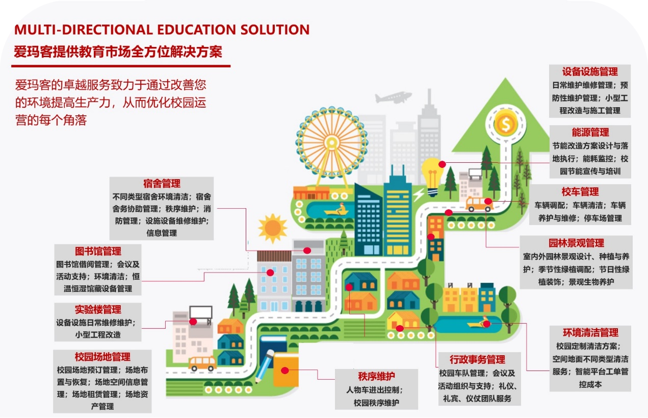 爱玛客成立于1936年,作为全球领先的多元化服务企业,爱玛客提供全方位综合设施管理服务和餐饮服务。在教育领域,爱玛客根植于校园服务,为全球超过2500所教育机构和逾500万学生提供基于价值和成果的解决方案及最佳实践,诸如国际知名的约翰霍普金斯大学、西北大学、宾夕法尼亚大学、乔治华盛顿大学等。