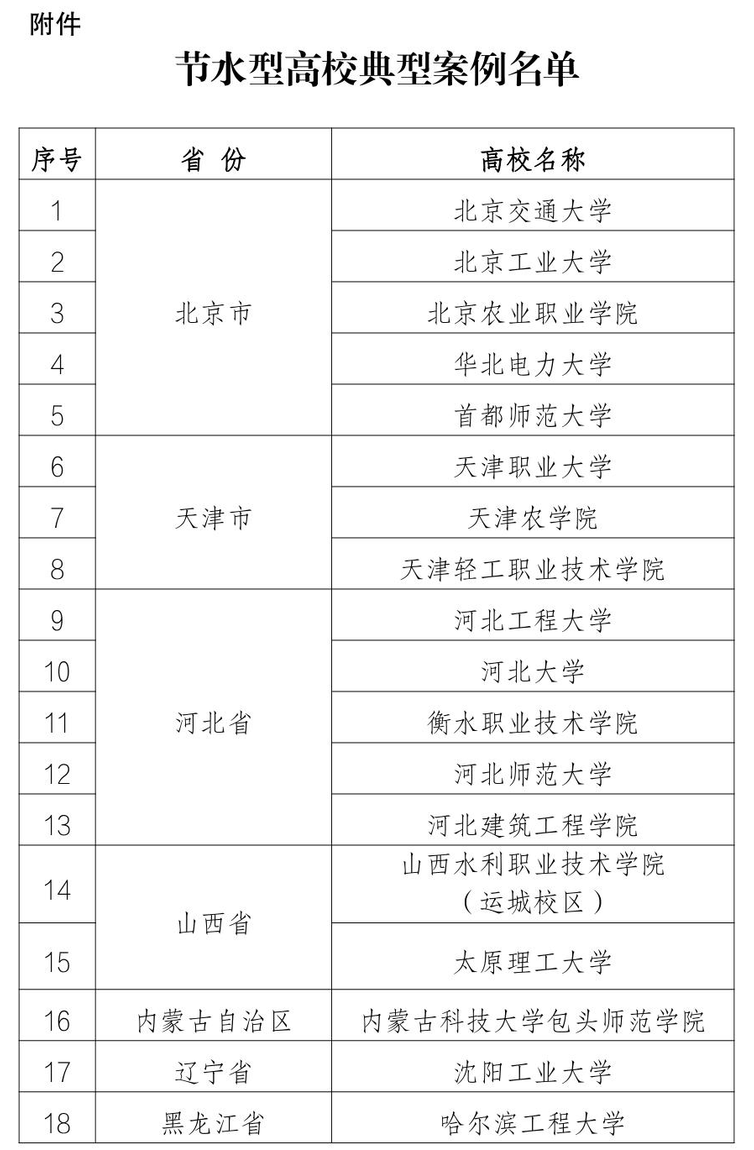 为贯彻落实《国家节水行动方案》,引领带动广大公共机构和全社会节约用水,根据《水利部办公厅、教育部办公厅、国家机关事务管理局办公室关于开展节水型高校典型案例遴选工作的通知》要求,由省级水行政主管部门、教育主管部门、机关事务管理部门联合组织申报和审核推荐,经水利部、教育部、国家机关事务管理局进行专家评审、现场复核、综合评议和公示,遴选出88家节水型高校典型案例,现将名单予以公布,典型案例概况可上全国节水办网站查询。