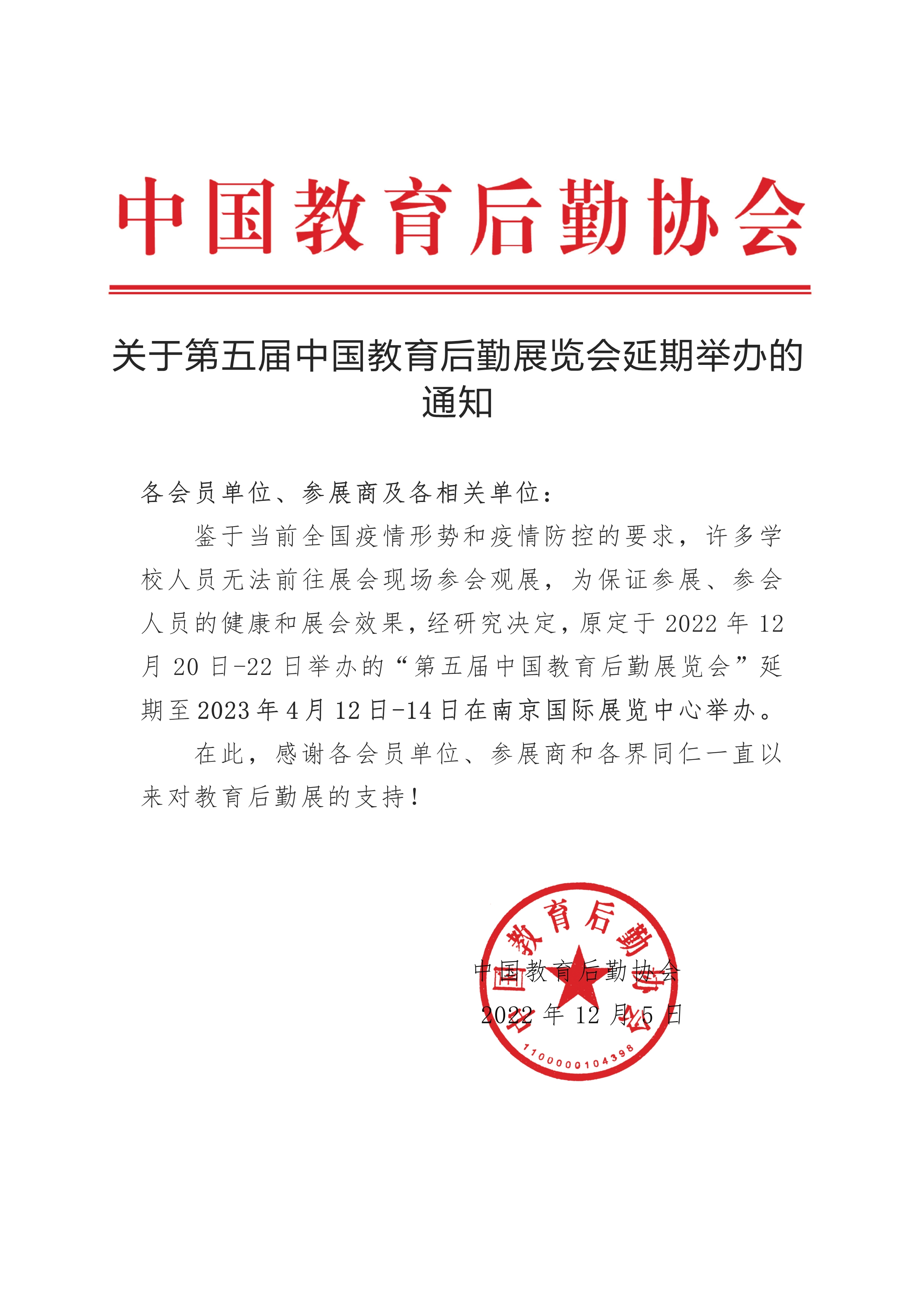 鉴于当前全国疫情形势和疫情防控的要求,许多学校人员无法前往展会现场参会观展,为保证参展、参会人员的健康和展会效果,经研究决定,原定于2022年12月20日-22日举办的“第五届中国888集团welcome大厅览会”延期至2023年4月12日-14日在南京国际展览中心举办。