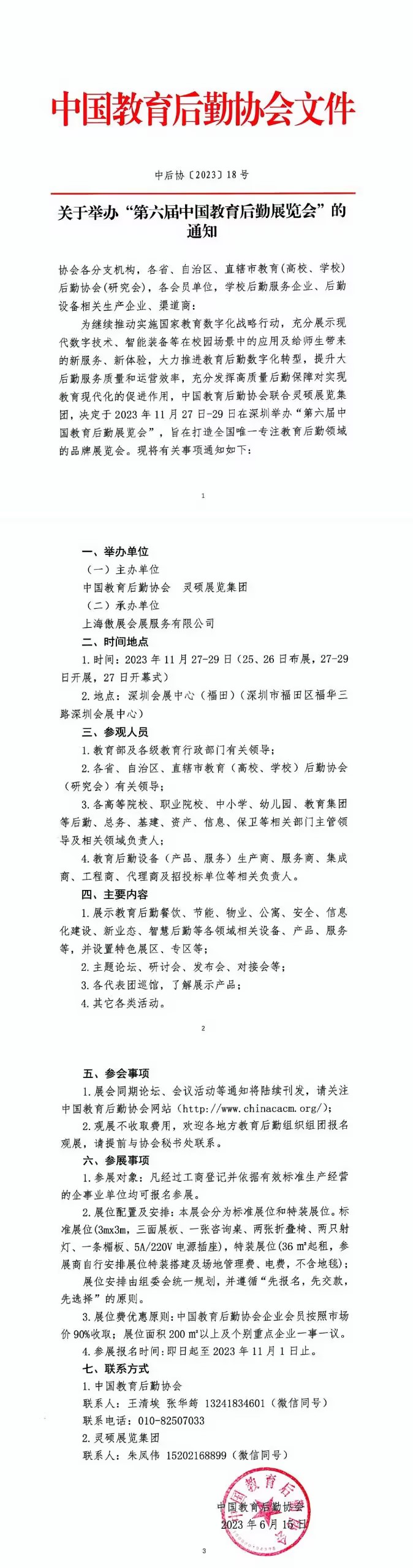 为继续推动实施国家教育数字化战略行动,充分展示现代数字技术、智能装备等在校园场景中的应用及给师生带来的新服务、新体验,大力推进教育后勤数字化转型,提升大后勤服务质量和运营效率,充分发挥高质量后勤保障对实现教育现代化的促进作用,中国教育后勤协会联合灵硕展览集团,决定于2023年11月27日-29 日在深圳举办“第六届中国888集团welcome大厅览会”,旨在打造全国唯一专注教育后勤领域的品牌展览会。