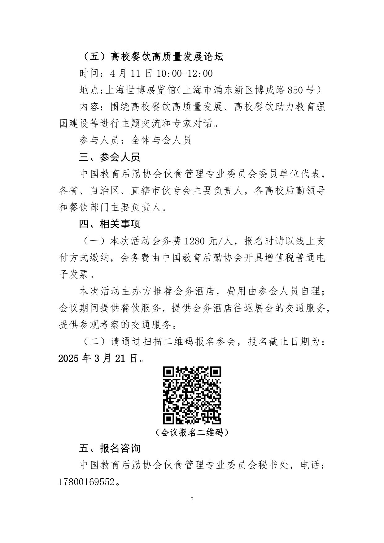 为深入学习贯彻习近平新时代中国特色社会主义思想、党的二十大和二十届三中全会精神、全国教育大会精神,深刻领悟习近平总书记关于教育强国的重要论述,积极响应国家教育数字化战略行动,大力推动数智技术在高校餐饮领域的应用,牢固树立安全是教育事业高质量发展的生命线,切实抓好高校餐饮安全管理工作,始终坚持以师生为中心的服务理念,以创新助力高校餐饮高质量发展,根据《中国教育后勤协会伙食管理专业委员会组织规则》,经中国教育后勤协会批准,决定召开“中国教育后勤协会伙食管理专业委员会第二届委员会第五次全体委员会议暨高校餐饮高质量发展论坛”。现将具体事项通知如下: