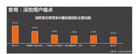 消费不断升级,用户对产品的新能、外观、服务都是在不断提升,这也是企业不断开发产品,不断推动产品发展的原动力。根据调研结果显示,用户对产品的吐槽点或者痛点主要集中在体积太大,不能随时了解水质,不能监控到换芯还有出水量等问题,这些痛点都在不断推动企业加速升级产品。从近几年企业新品开发的方向来看,确实得到了很多改观。比如节省空间的问题。中国的厨房与西方相比是相对比较小的,60%——80%的厨房面积都在5到8平米以下,因此橱柜也很小。很多消费者购买完产品安装以后发现,橱柜空间不够大,只能选择将产品放在台上或者挂在墙上,影响美观。目前已经有一些主流品牌针对用户的痛点开发了一些体积比较小的产品,这些产品投放到市场上也获得了很好的销售结果。已经占到市场的10%—12%销售额。