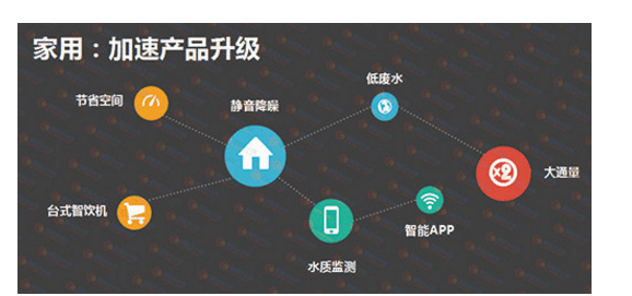 另外一个就是静音降噪。像行业中的AO·史密斯、安吉尔、3M等也开发了一些高端的产品,这些产品的噪音可以设计在40分贝。从现在的消费来看,这种产品占到市场的6%左右,虽然占比较小,但这将是未来的发展趋势。还有就是智能APP等,从净水行业来讲,通过搭载智能APP可以实现远程操控,包括检测水质等,现在这种智能产品在市场的比重大概在9%,也是一个很大的趋势。