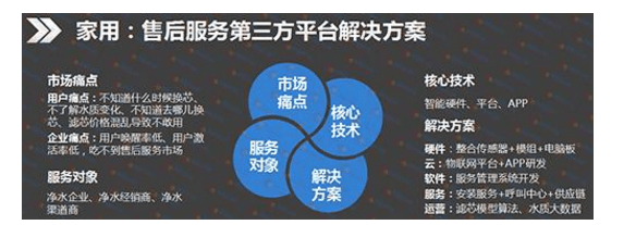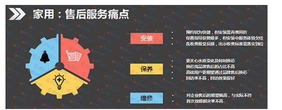 对净水产品来讲,只有产品和营销还是不够的,因为净水产品需要后期的安装还有维护,不像冰箱和彩电这样的产品,插上电就可以用,它需要专业的人去跟踪服务。从这几年的发展来看,服务的短板已经成为制约行业和企业发展的非常大的因素。目前售后方面,服务的痛点主要集中在安装环节中的便利性、便捷性以及乱收费的问题,还有维修故障率解决并不高。在这样的市场大环境之下,一些专业的净水服务平台顺势崛起,这些专业净水服务平台可以为经销商和厂家提供完整的解决方案。