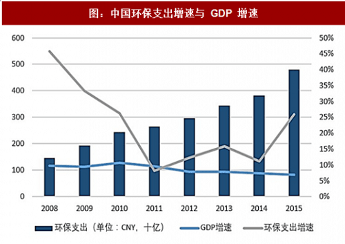 图:中国环保支出增速与 GDP 增速(来源:观研天下)