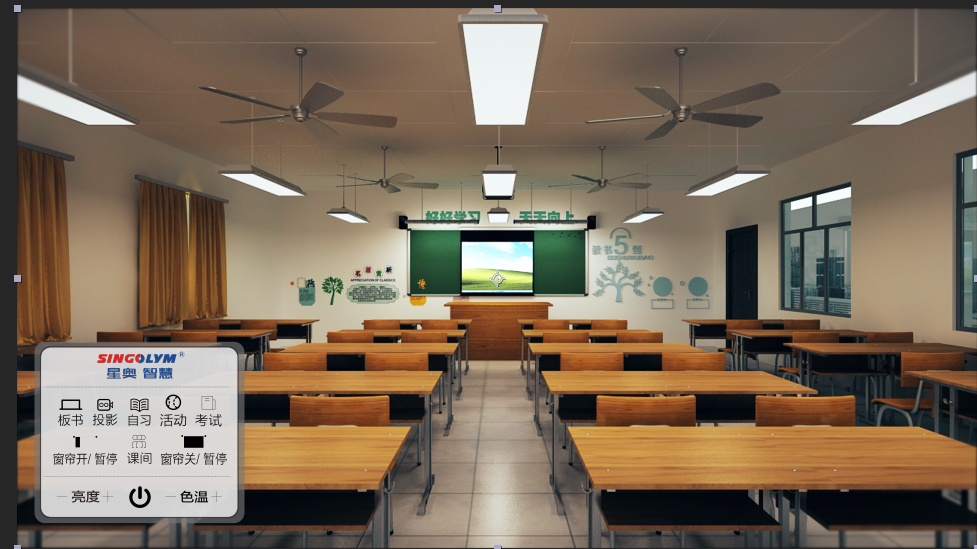 星奥LED护眼灯具智能控制系统优势显著:同时预设板书、课间、投影、自习、活动、考试六种模式,触摸屏开关一键控制,实现灯具与电动窗帘智能物联,提高教学光环境自适应能力。