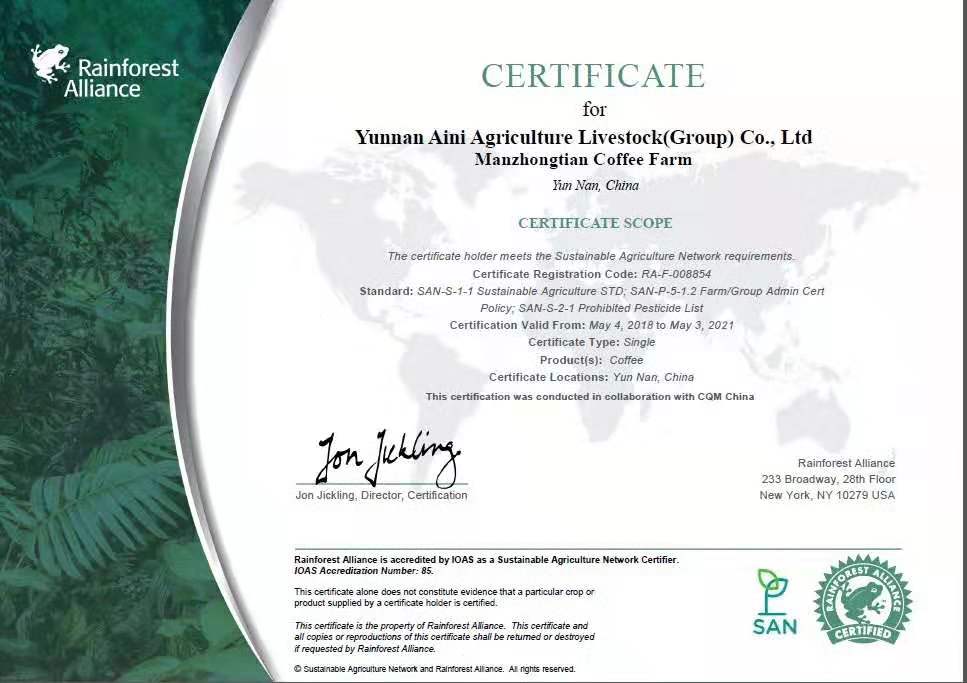 易咖在云南普洱第一期合作了5000亩的专属雨林咖啡种植基地,打造了tree to cup(从咖啡树到一杯现萃咖啡)的自主供应链,以种植于海拔1100米以上的AA级阿拉比卡咖啡豆为原料,咖啡豆均有国际雨林联盟认证和有机产品认证。