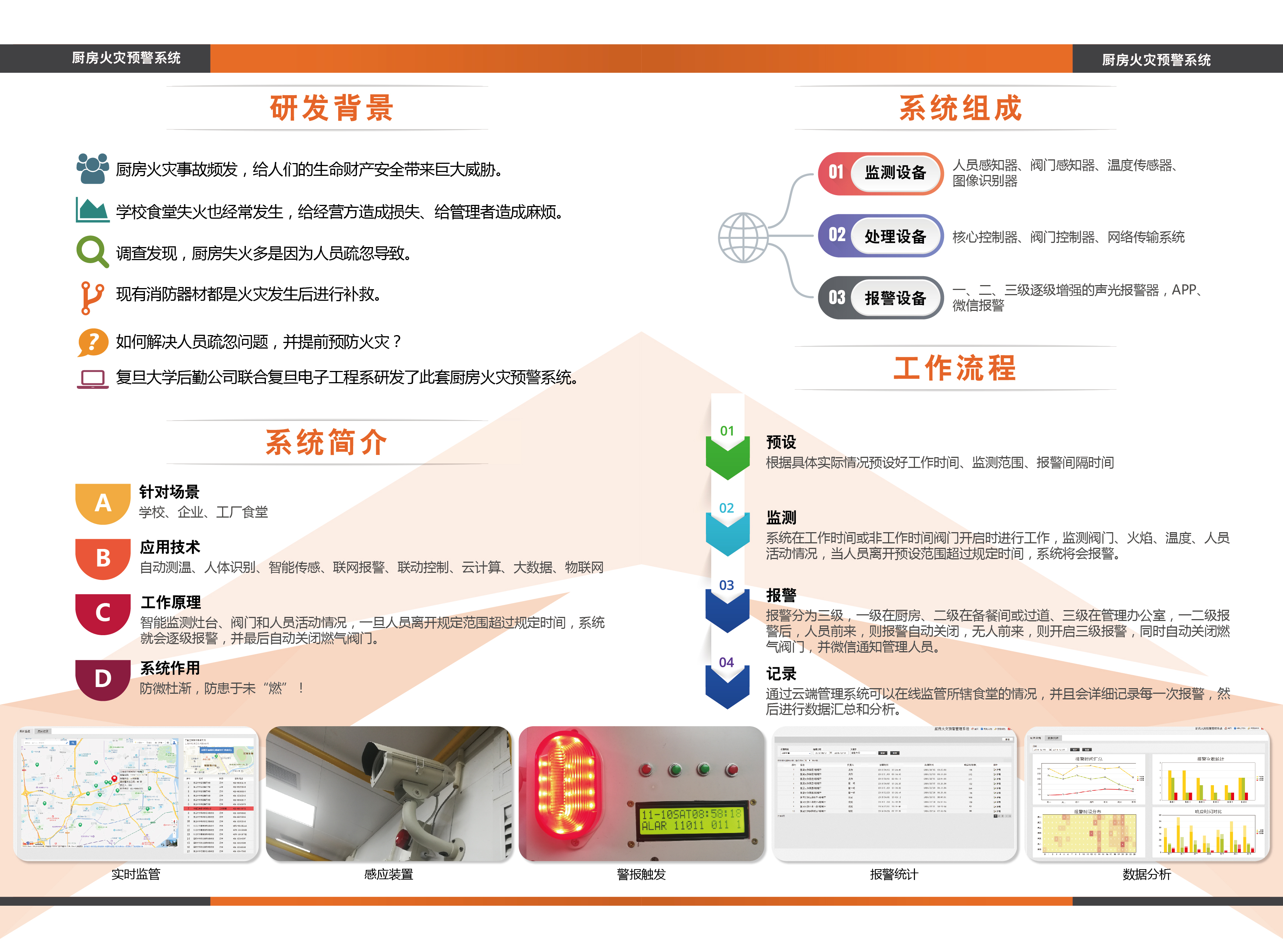 由复旦后勤公司和复旦电子工程系共同研发,通过监测感应厨房灶台、阀门、温度及人员活动情况,一旦人员在火开着的情况下离开规定范围一定时间,系统就会发出三级逐级增强的报警,且将报警信息推送到相关负责人的手机及后台管理平台,最后自动关闭燃气阀门,起到提前预防厨房失火的作用。本系统可免费提供给各兄弟高校试用。