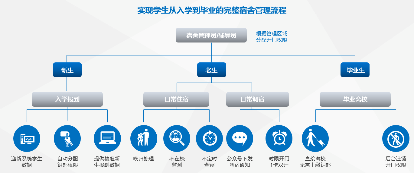 原宿舍管理采用人工,以一栋楼165间宿舍,一个宿舍住4人为例,宿管阿姨在毕业生离校需要给660个毕业生对接回收钥匙,再与660个新生对接分发钥匙,工作量大,时间线长,数据繁杂,前后需要将近两个月的时间。