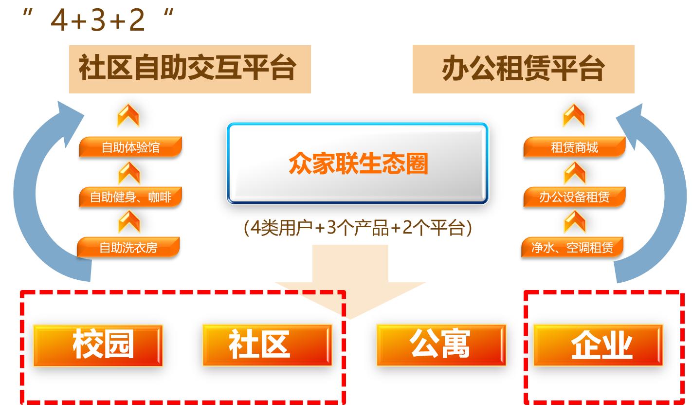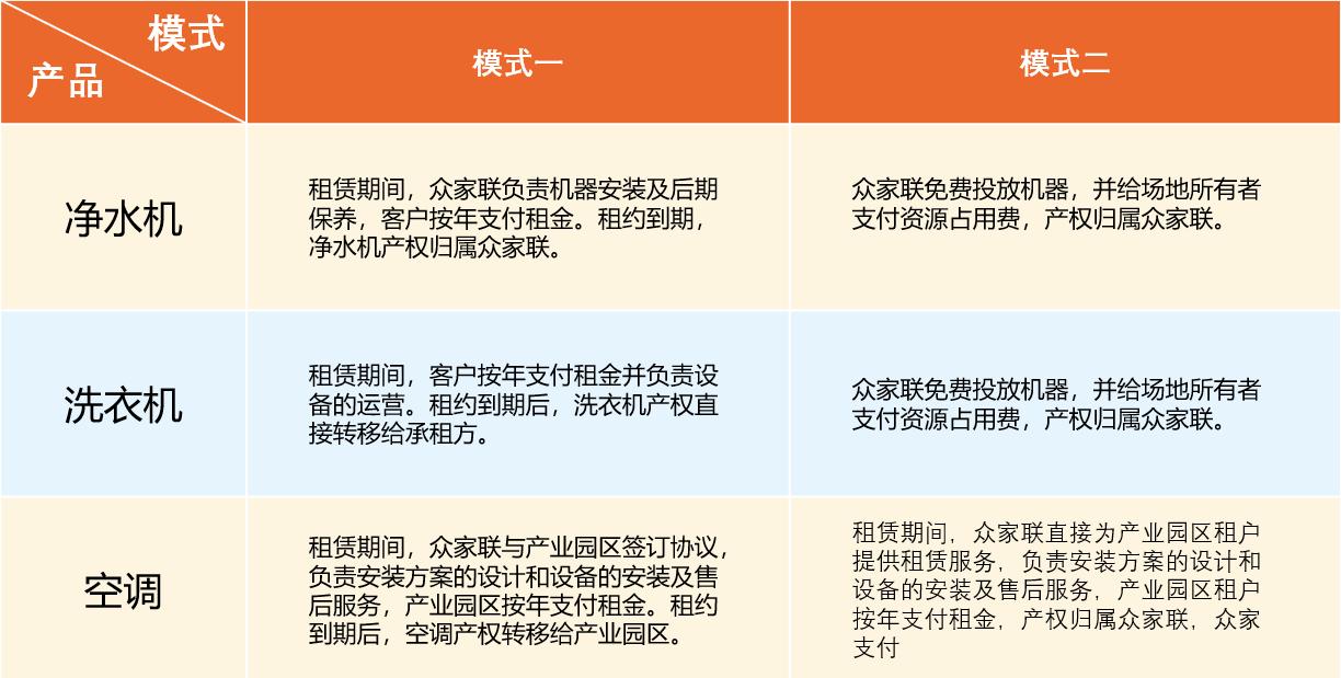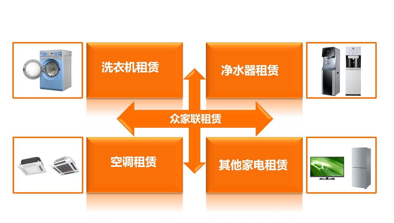 按照“立足节约社会资源,培育消费新观点,引领生活、办公新时尚”的工作思路,众家联租赁积极投入人力、物力,在国内一线城市开拓电器租赁市场,培育新的消费习惯。众家联已与30余家高校及园区展开合作,完成空调及洗衣机铺设,覆盖商用洗衣机、商用净水、商业空调等多个领域。