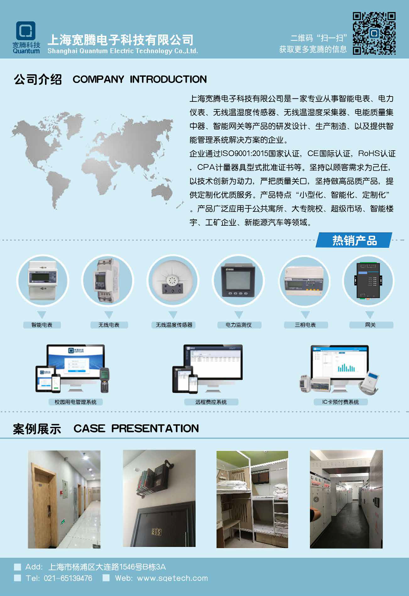 上海宽腾电子科技有限公司是一家专业从事智能电表、电力仪表、无线温湿度传感器、无线温湿度采集器、电能质量集中器、智能网关等产品的研发设计、生产制造、以及提供智能管理系统解决方案的企业。